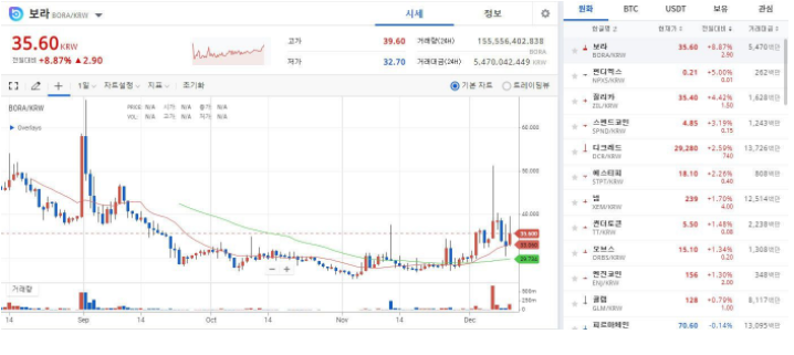 업비트 거래소에서는 보라(BORA)가 +8.87%로 가장 높은 상승률을 보이고 있습니다. 보라는 이미 지난 12월 6일 큰 상승을 보인 후 다시 조정을 받았고,