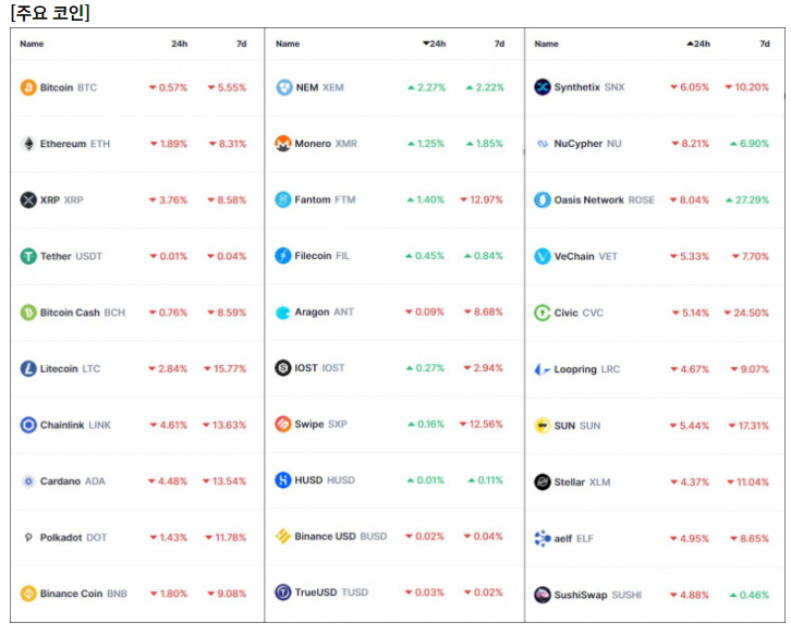 전일 시가총액 상위 코인은 모두 5% 이내 조정을 받았으며, 알트코인 중 가장 상승 폭이 컸던 넴(XEM)이 2%밖에 오르지 않았다는 점에서 대부분의 코인이 하락했다고 볼 수 있습니다. 대신 하락 폭이 가장 큰 코인도 -10%를 넘지 않는다는 점에서 시장은 현재 비트코인의 눈치를 보며 횡보하고 있다고 봐야할 것 같습니다.