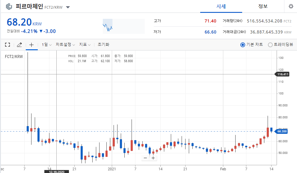 FCT2는 현재 거래량 최근 1일 368억이며 거래량이 많은 반면에 2월 초부터 큰 상승세 없이 꾸준하게 안정정인 상승이 진행이 되고 있으며 업비트 원화마켓 상승한 지난 2020년 12월 8일 이후 큰 상승 및 하락없이 지지선을 구축한것이 인상이 깊습니다.